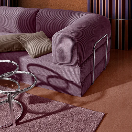 Comprising two quality mattresses and two angled cushions, TEDDY is designed for easy rearrangement. Secured by three chrome-plated metal bars, TEDDY maintains its flexibility. The mattresses, crafted from high-grade cold foam, strike a balance between firm support and comfort for both sitting and sleeping. The angled cushions are filled with silicon ball fiber encased in an inner fabric sleeve, allowing for easy removal of the outer fabric without disturbing the foam. TEDDY is swathed in plush corduroy fabric known for its exceptional quality and durability.